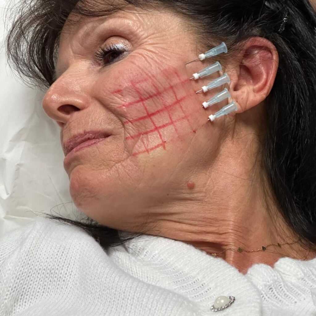 - Les fils biostimulants, monofilaments bioresorbables, sont insérés sous la peau à l’aide d’une fine aiguille ou d’une canule.